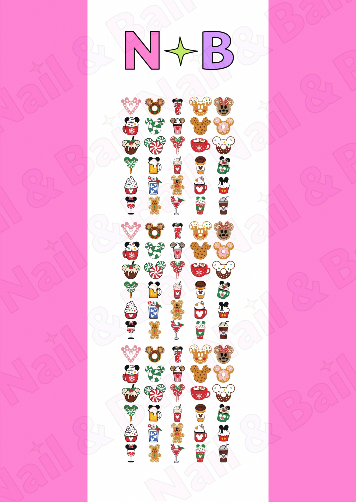 Satisfy your festive cravings with Mickey’s Sweetmas. This sheet includes 90 designs featuring Christmas-themed Mickey and Minnie treats including cookies, cocoa mugs, candy canes, gingerbreads, milkshakes, and desserts. Perfect for cozy sweet holiday nails.
