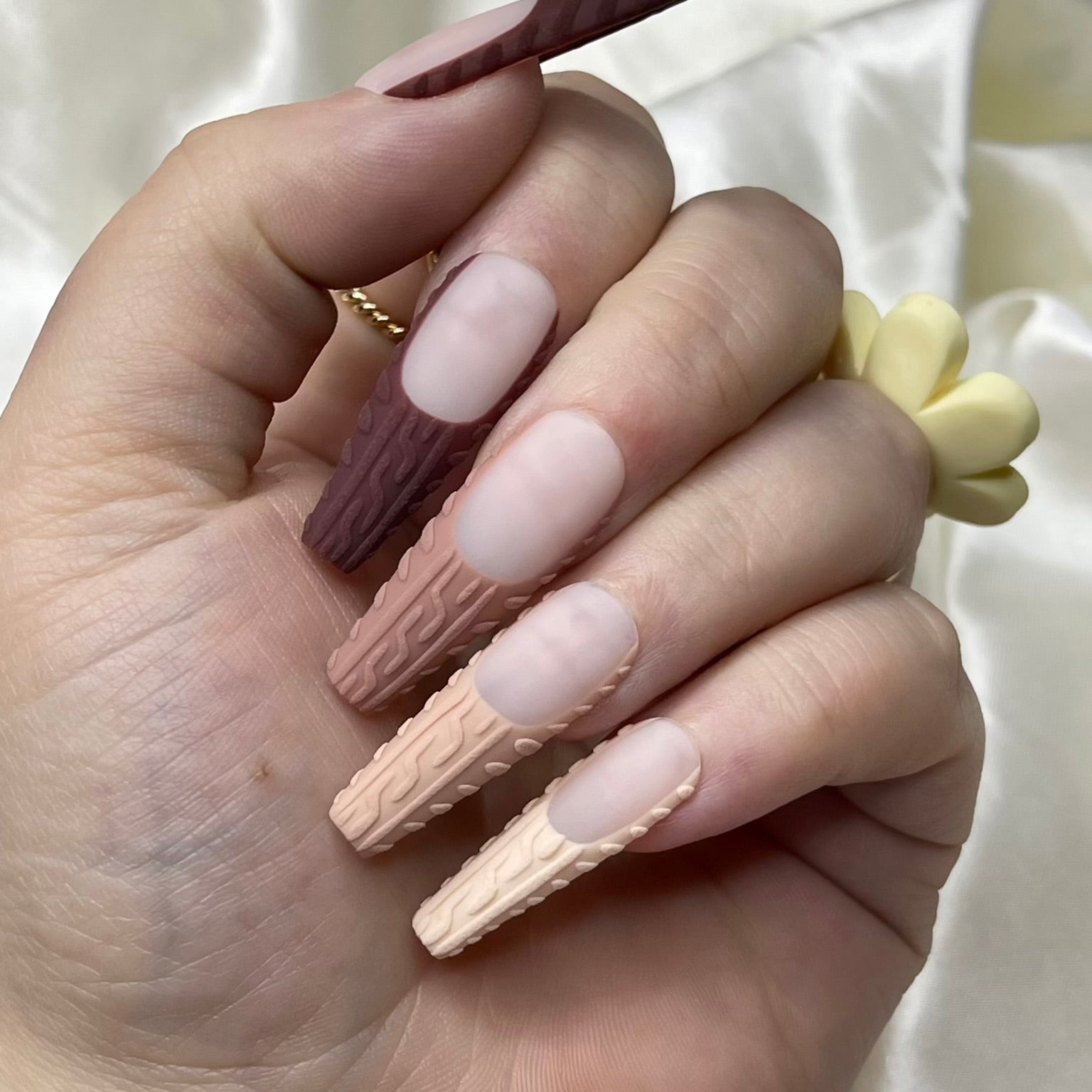 One of the cutest autumn nail trends in 2025 is sweater inspired textures. Matte bases paired with raised, embossed cable knit patterns are giving cosy girl chic all over socials. Think creamy whites, warm caramels, and pumpkin oranges with that soft, fabric like detail.