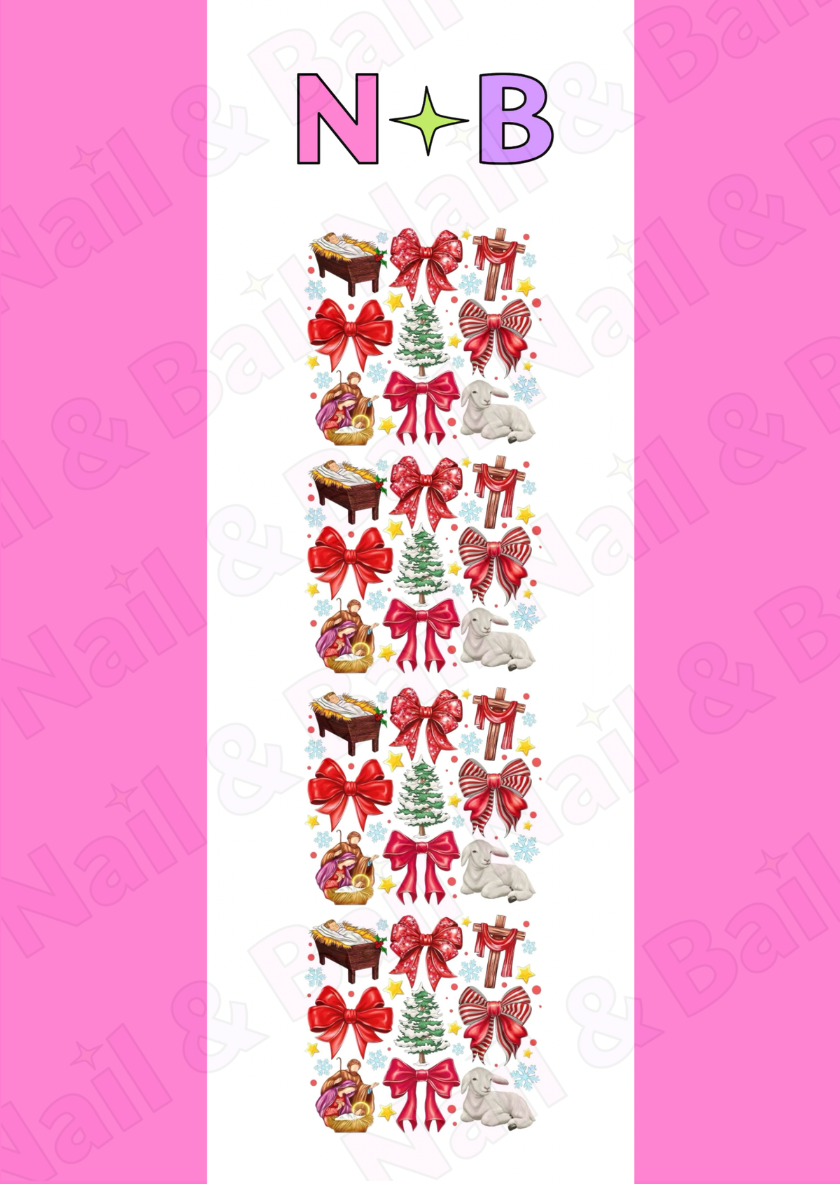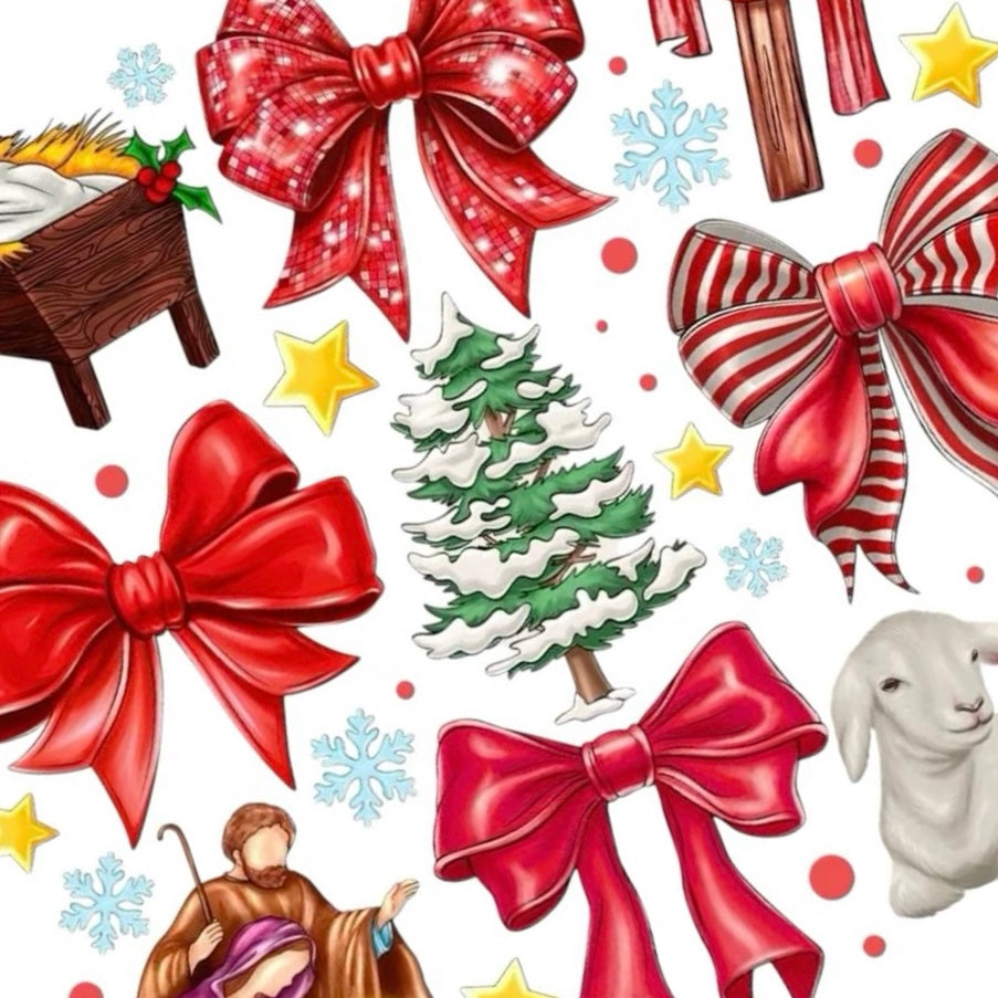 Bring warmth and meaning to your Christmas manicure with Merry Manger. This sheet includes 36 decals featuring classic nativity imagery, including baby Jesus in the manger, a gentle lamb, festive red bows, Christmas trees, and delicate snowflakes that capture the peaceful beauty of the season.