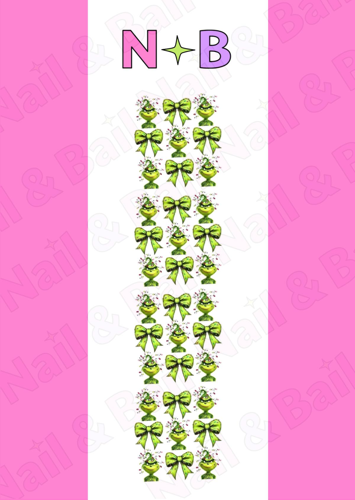 These decals are perfect for anyone who loves fun festive nail art with a cheeky edge. Mix and match the Grinch faces and light covered bows for a look that glows with Christmas personality.