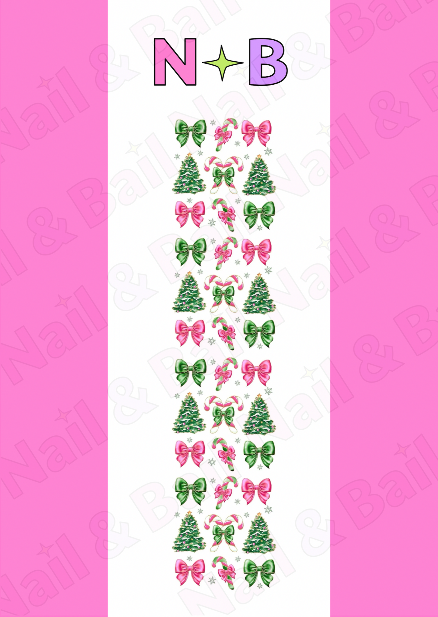 Sweeten your Christmas nails with Candy Cane Dreams. This sheet includes 36 designs featuring pink and green bows, Christmas trees, candy canes, and snowflakes. The perfect mix of festive, girly, and classic Christmas fun.