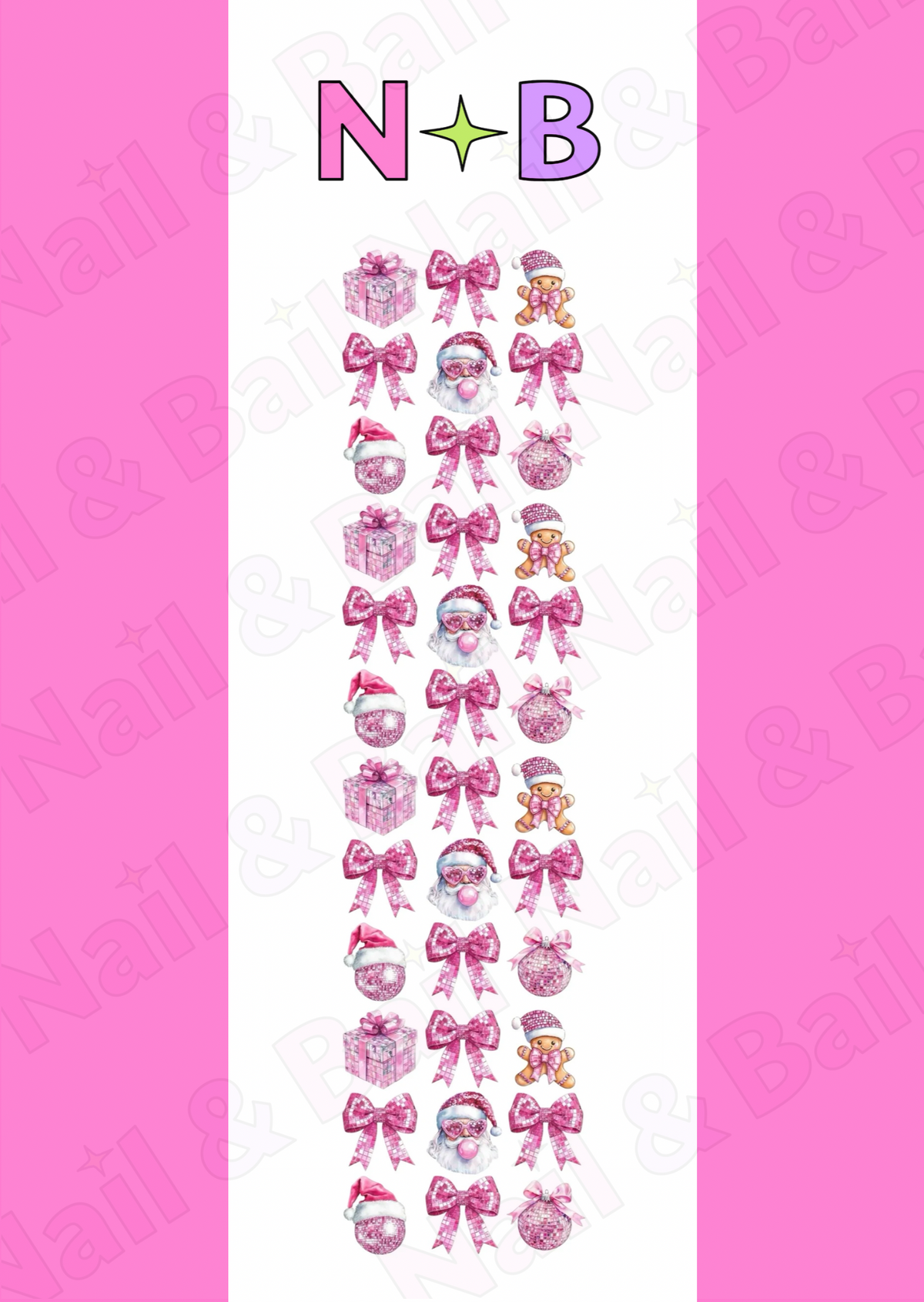 Get your nails ready for the ultimate Pinkmas Party. This sheet includes 36 designs featuring disco-ball pink bows, bubblegum Santa, glittery baubles, pink presents, and gingerbread cuties. Perfect for glam festive nails that sparkle all season long.